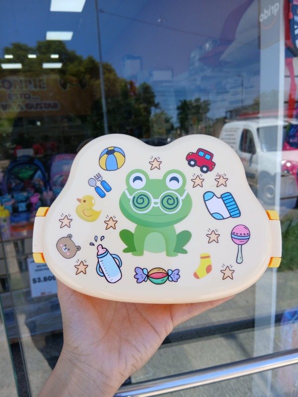 Tupper infantil con forma de cabeza de rana, con diseño simpático y colorido que hace más divertido el momento de la comida para los chicos. Su formato orgánico con bordes suaves lo vuelve cómodo de manipular y atractivo visualmente.