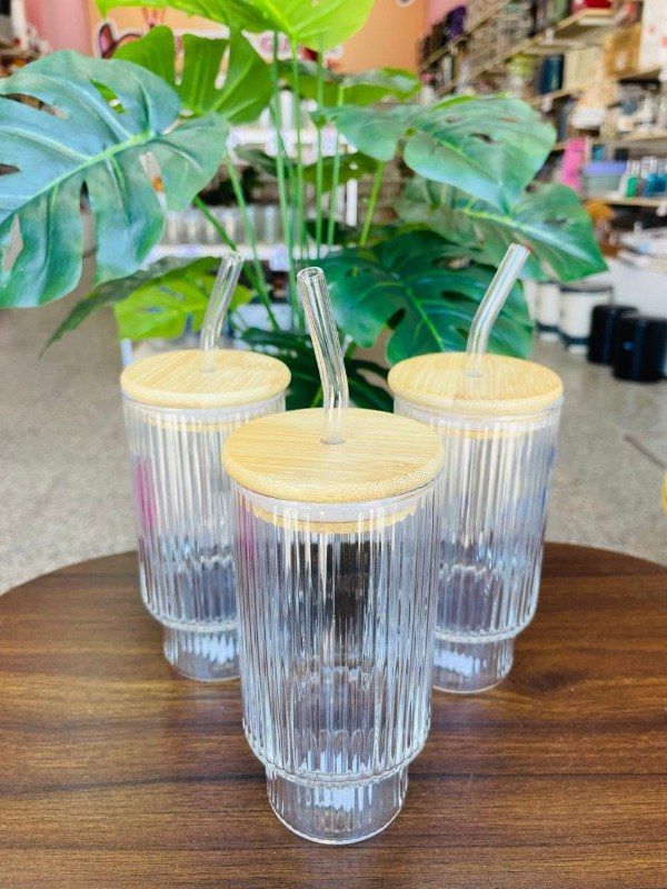 🌱🍹 ¡Estilo Ecológico y Moderno! Vaso Acanalado con Tapa de Bambú y Sorbete de Vidrio 🍹🌿